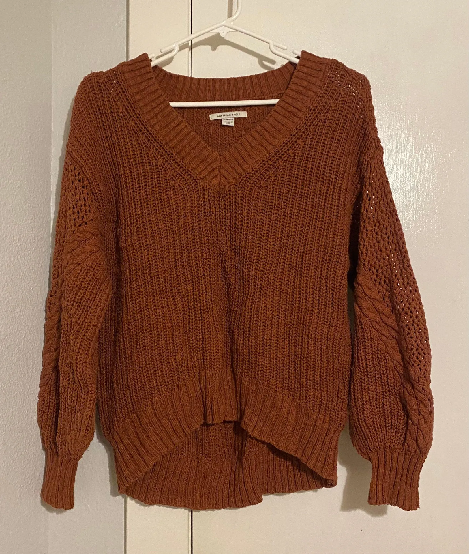 Great quality, thick material, size xs, fits oversized, burnt orange color.