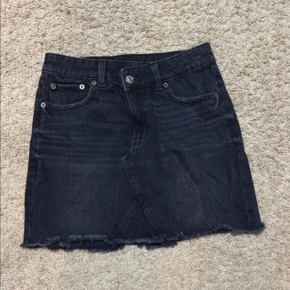 Chic dark denim mini skirt. Features a stylish frayed hem. Perfect for everyday wear.