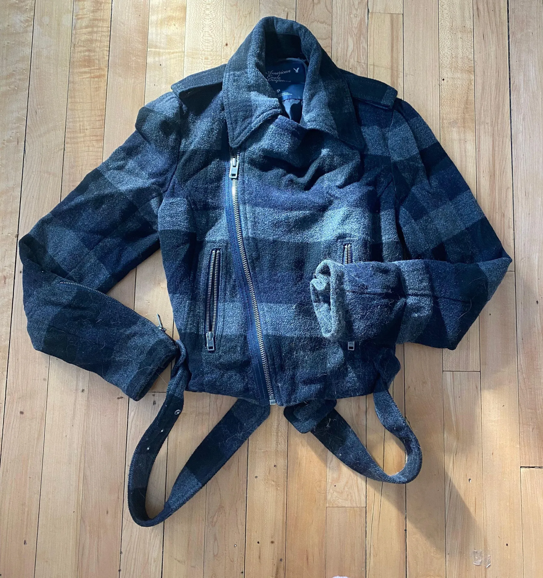 A side-zip moto style cropped jacket in black and gray woolen buffalo plaid. Has lots of zippers. A... Show more