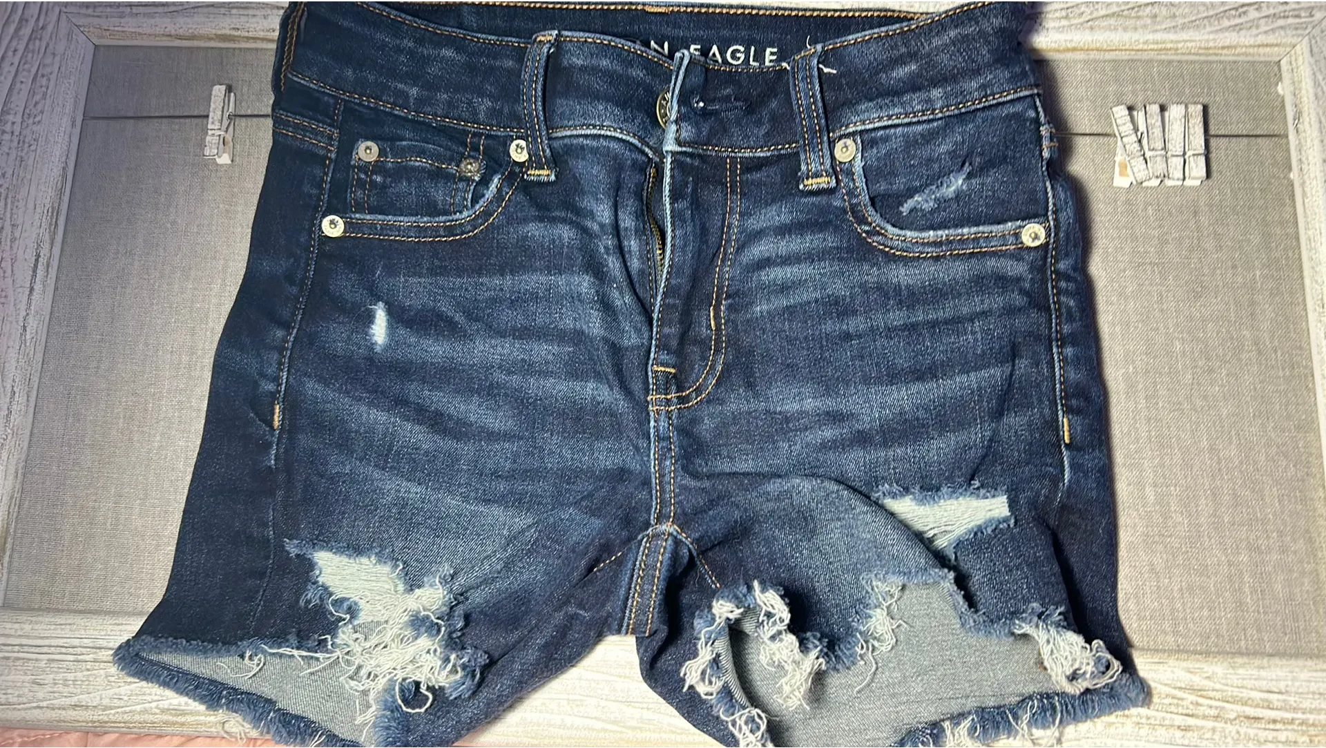 These dark blue Jean shorts are In excellent condition. Are basically brand new. The buckle is a lit... Show more