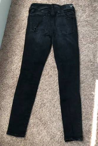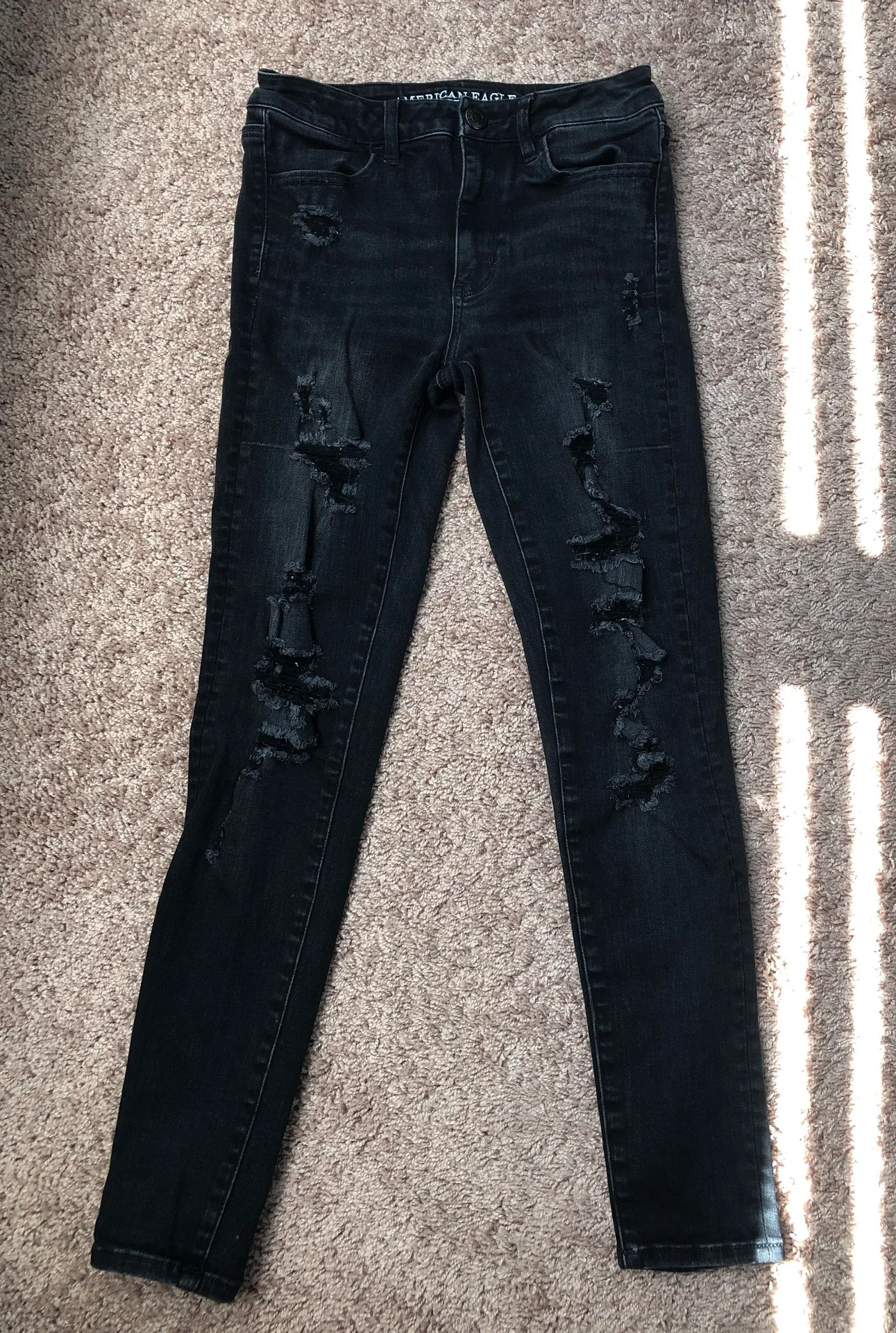 Black denim with many tips on legs. Good condition. Regular length high rise