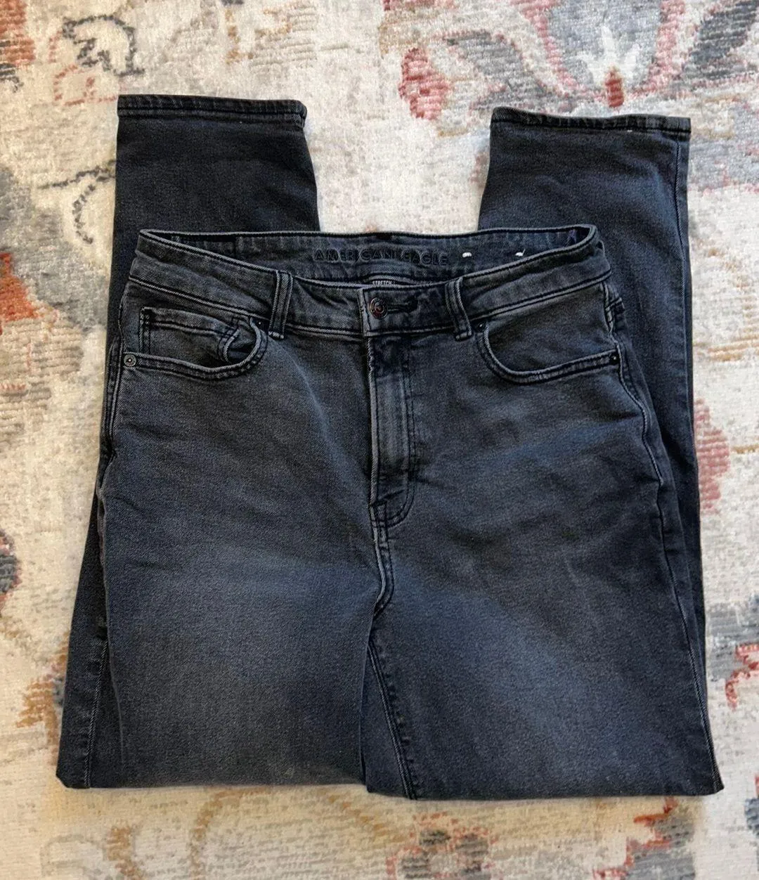 Size 8 regular American eagle black mom jeans. Super cute. Does have 2 small lighter stains as seen... Show more
