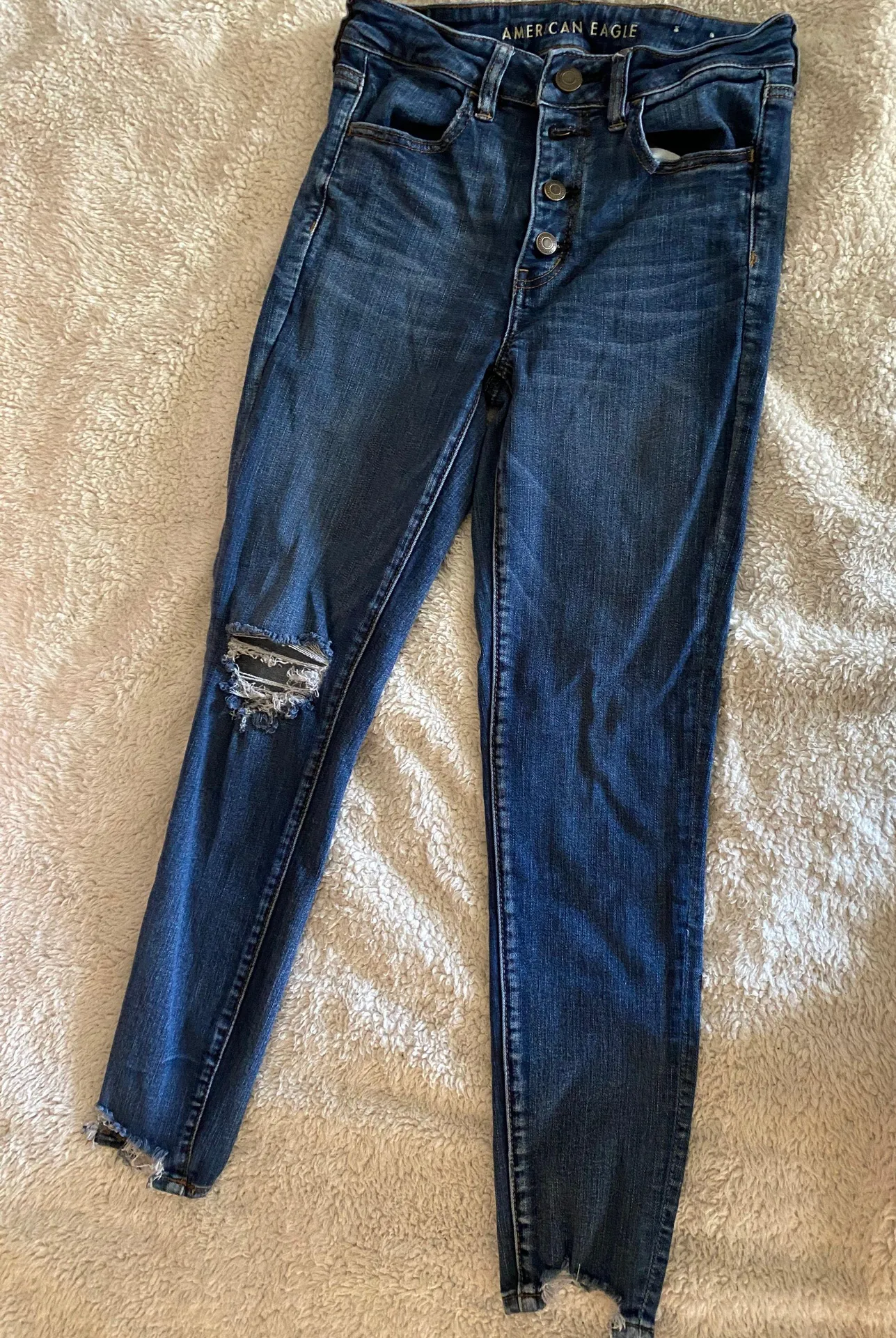 High rise with four buttons They are regular fit Size 8 Pretty stretchy Ankles have a ripped style