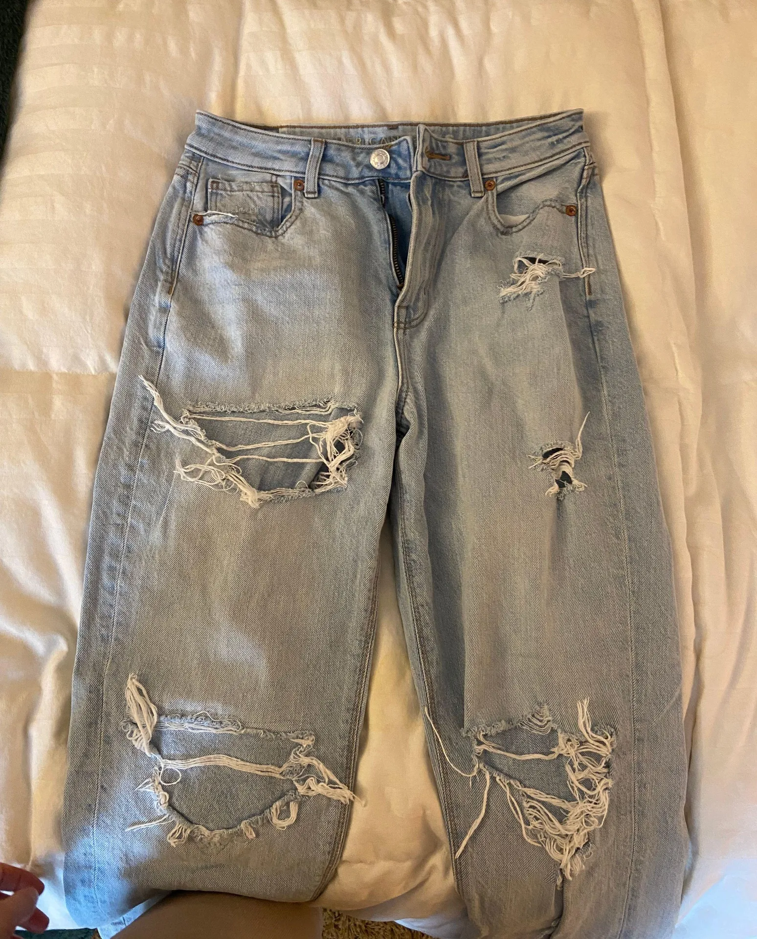 Lightly worn distressed light wash jeans. Selling because rip in the thigh is too large for my taste... Show more