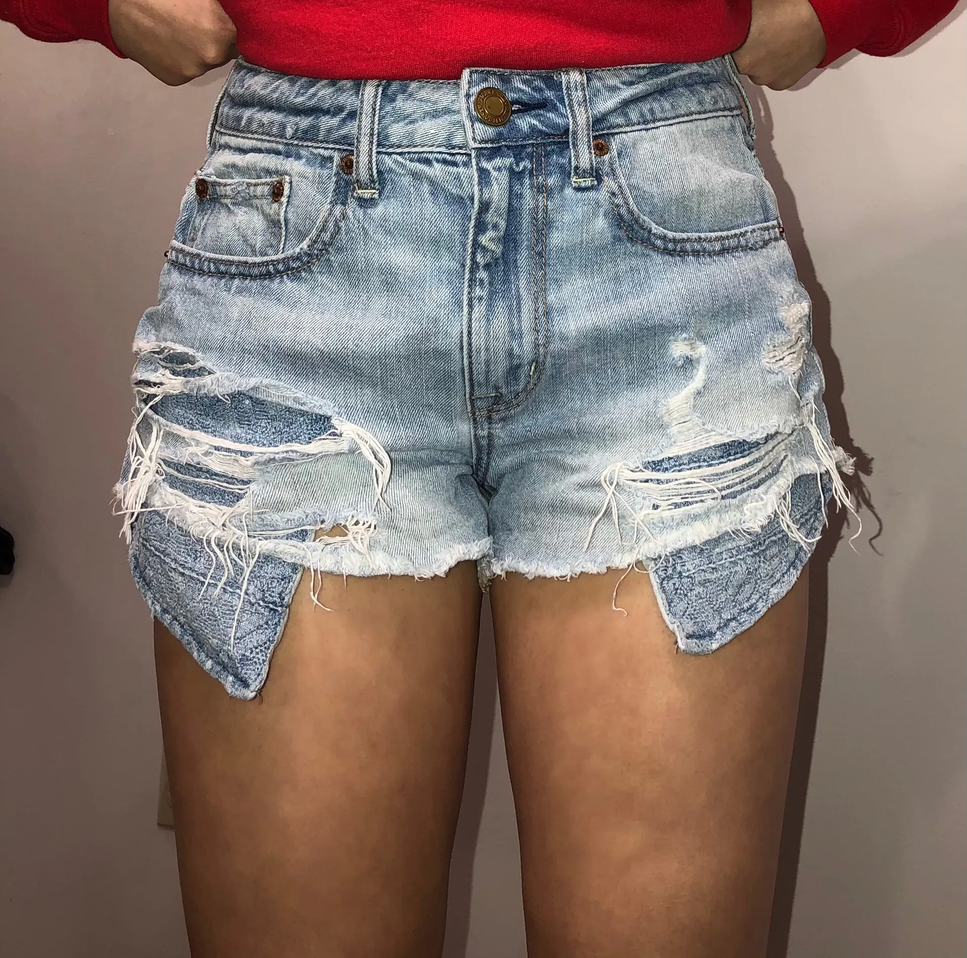 Light washed jean shorts in perfect condition! The pockets hang lower than the short length!