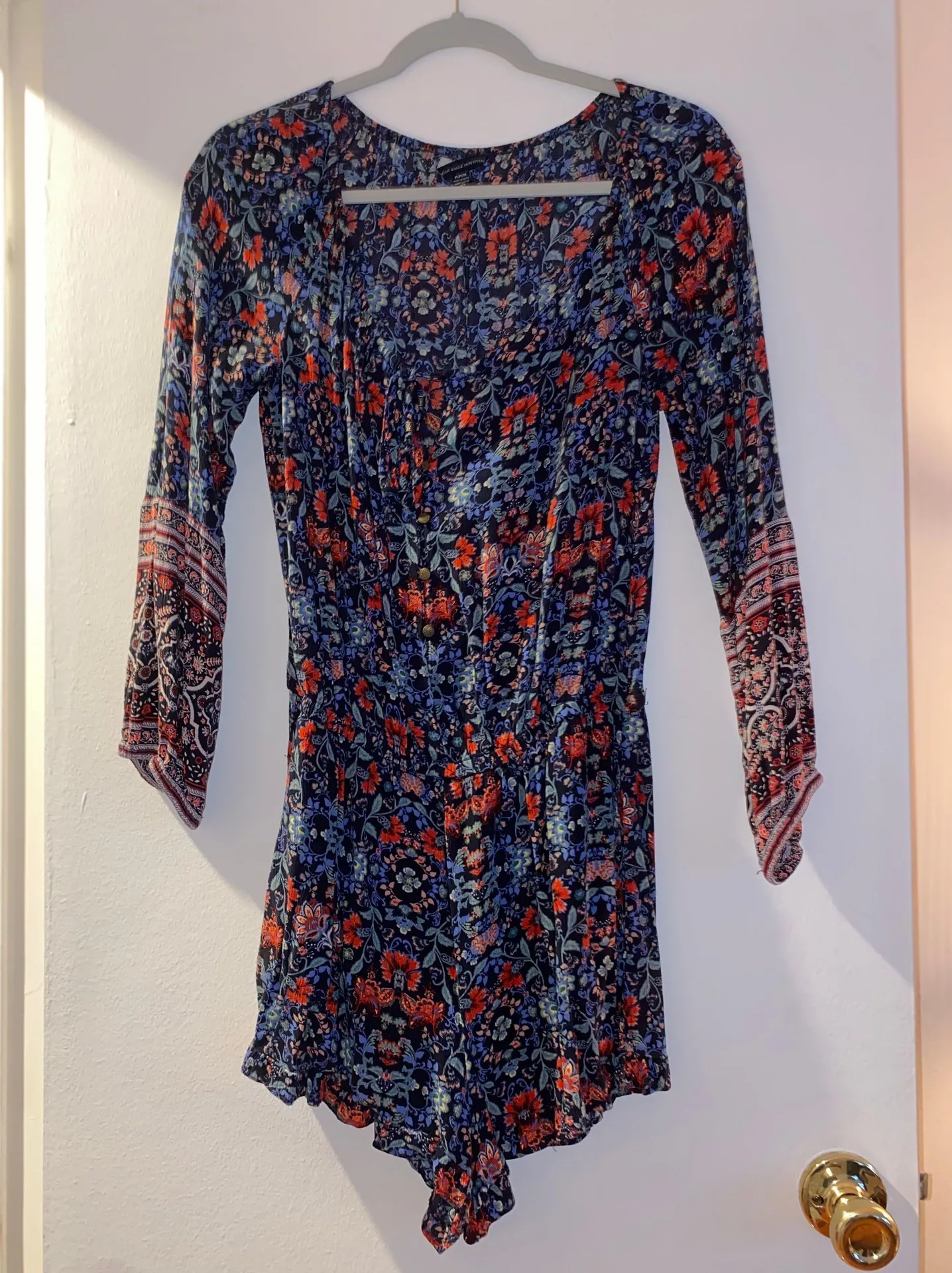 Printed long sleeve romper Ties and has buttons down the front