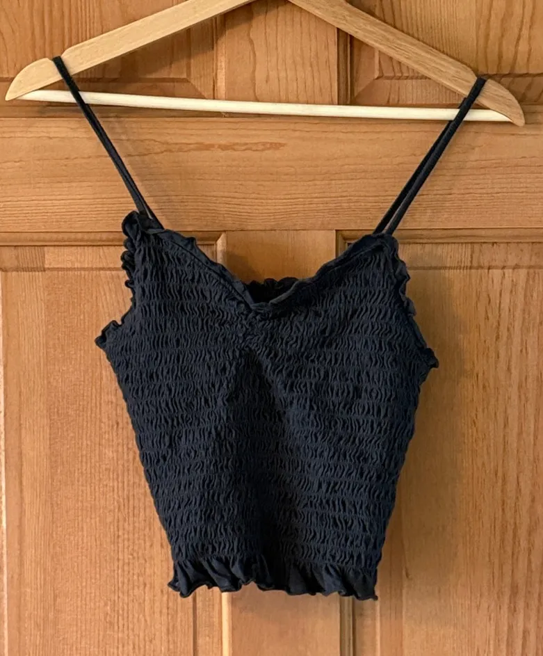 Elevate your style with this chic black smocked cami top. Perfect for any occasion, it offers a flat... Show more