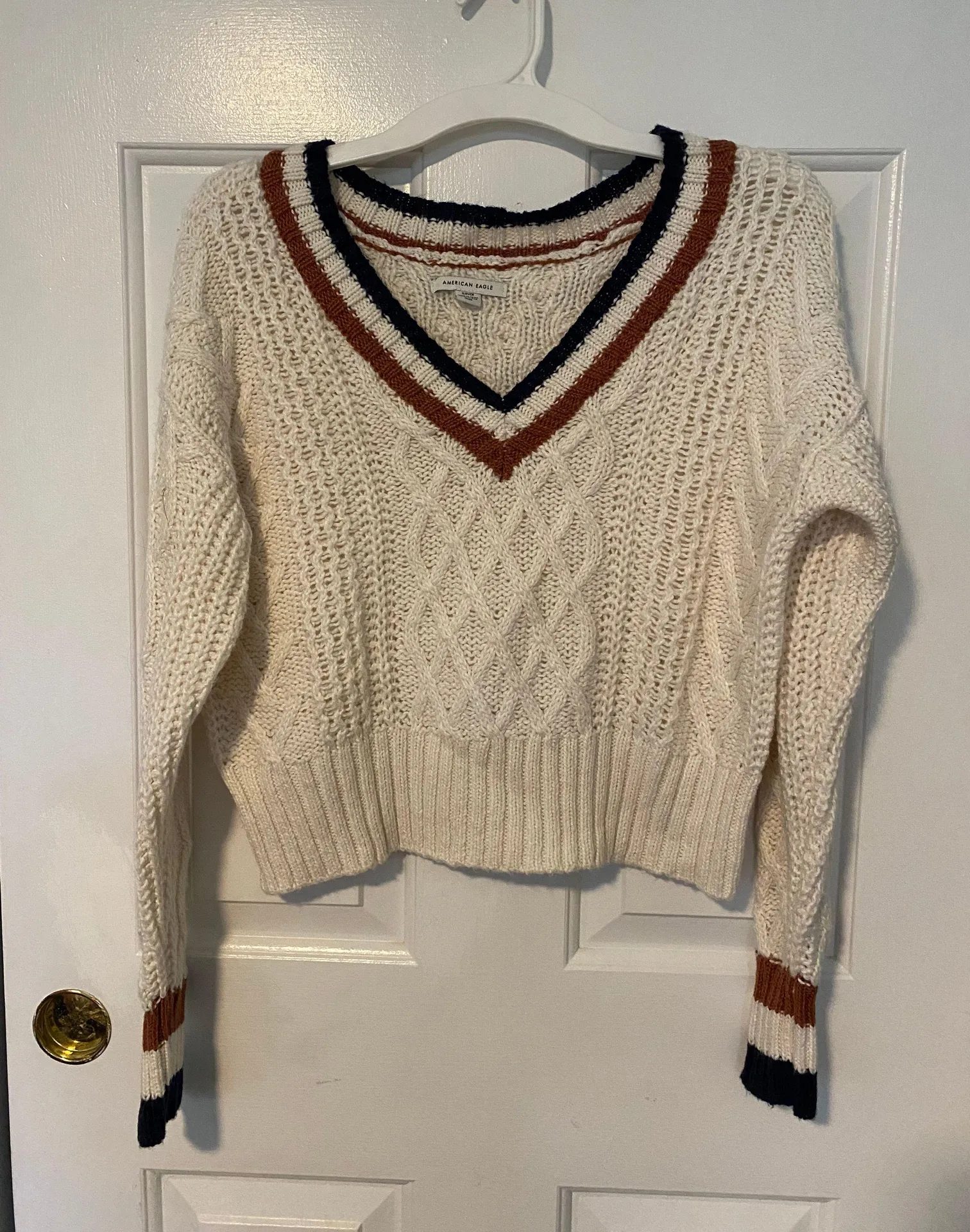 -white sweater with brown and navy details and cute knit pattern -worn once! Great condition
