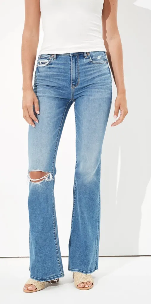 American Eagle Ripped Super Hi-Rise Flare Jean in Cool Hand Blue in excellent condition, no flaws. S... Show more