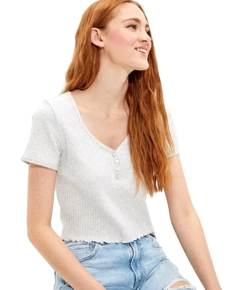 Elevate your casual wardrobe with this stylish grey ribbed crop top. The V-neck and henley button detailing provide a modern twist to a classic design. Perfect for pairing with high-waisted jeans or skirts, its versatile style makes it a must-have addition. Enjoy comfort and fashion in one chic package.