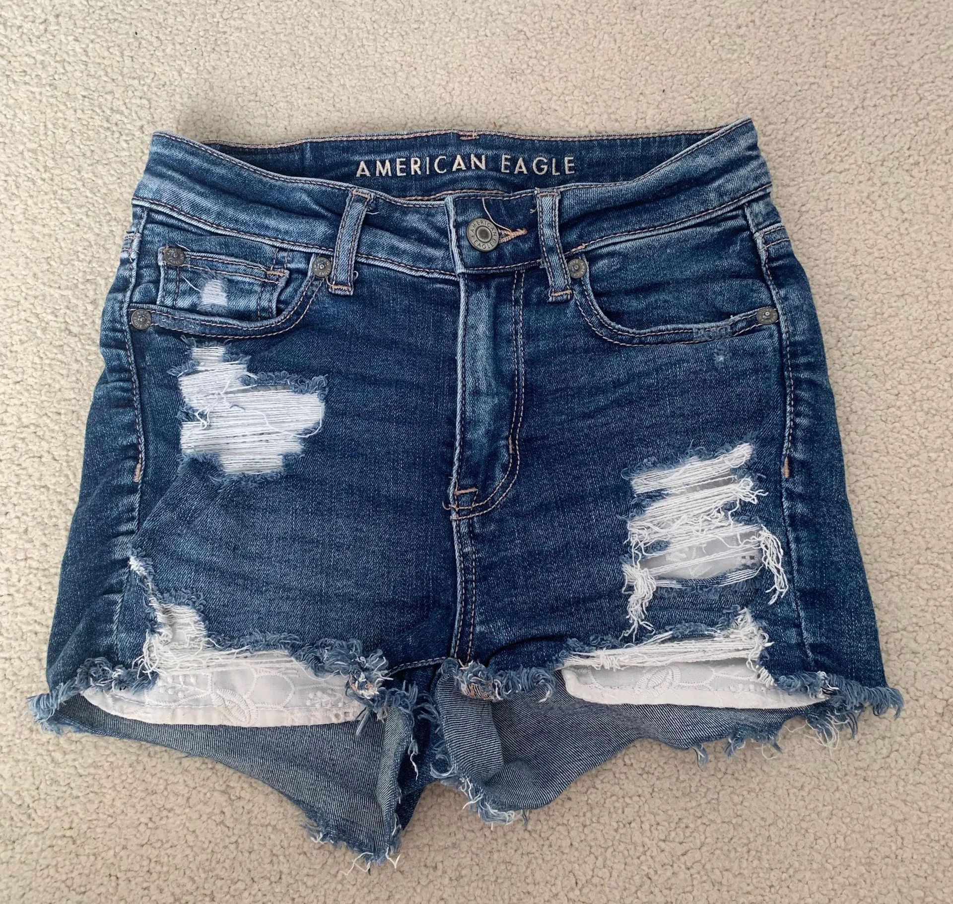 Super cute distressed denim shorts from AE with detailed pockets. They are in great condition and we... Show more