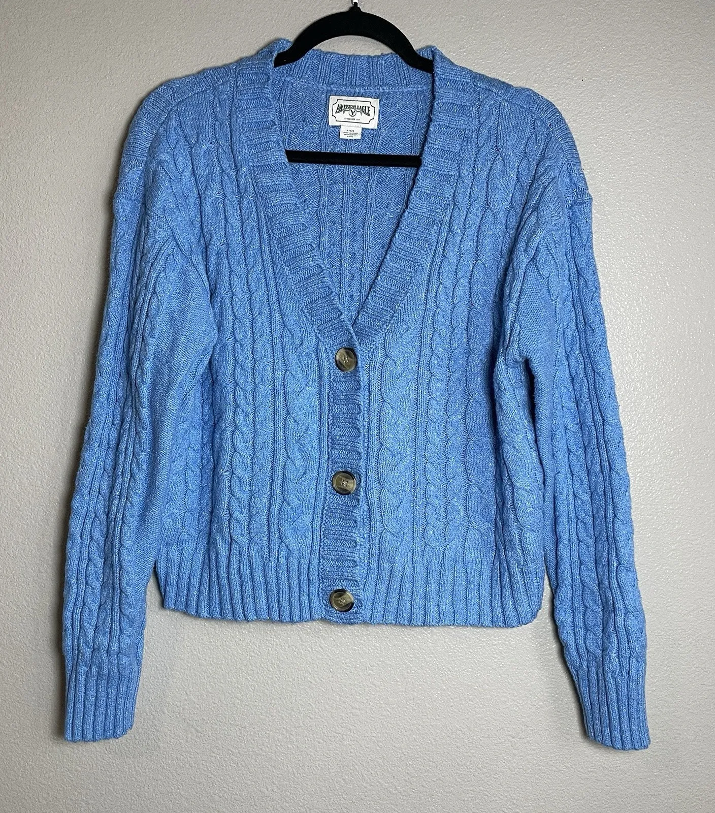 The American Eagle Size Large Cable Knit Cropped Cardigan Sweater in Blue is a stylish and versatile... Show more