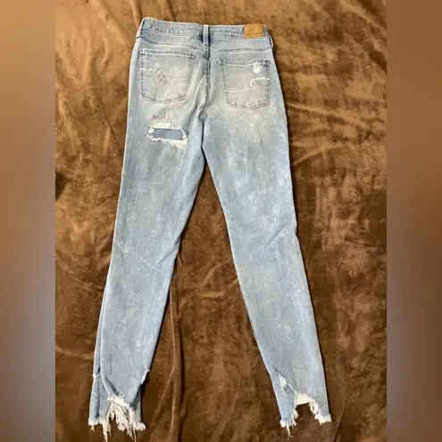 Stylish distressed jeans in a light blue shade. High waisted and super stretchy