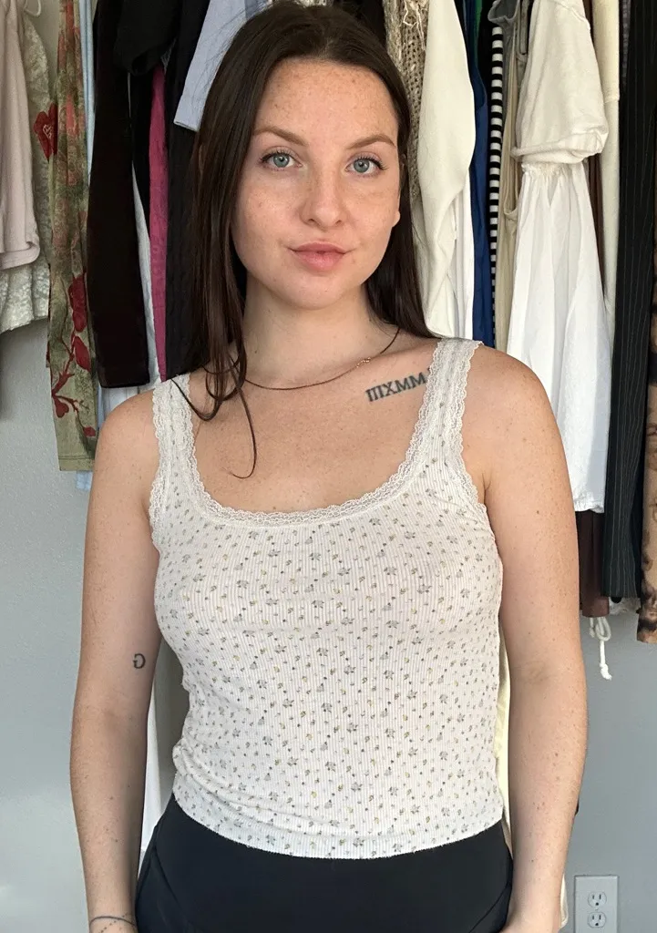 Cream ribbed tank top with a delicate blue and yellow floral print and lace trim along the neckline... Show more