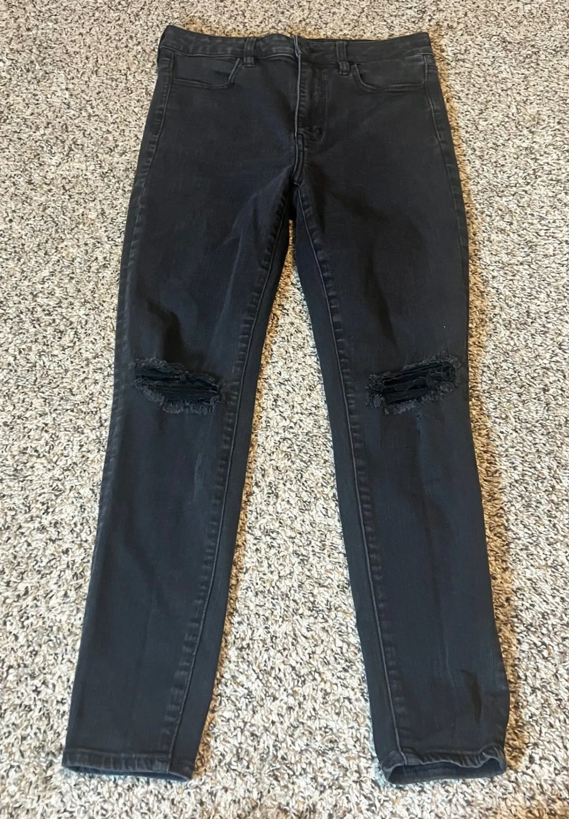 American Eagle Super Hi Rise Jegging Jeans in a classic black wash with distressed knee details. The... Show more