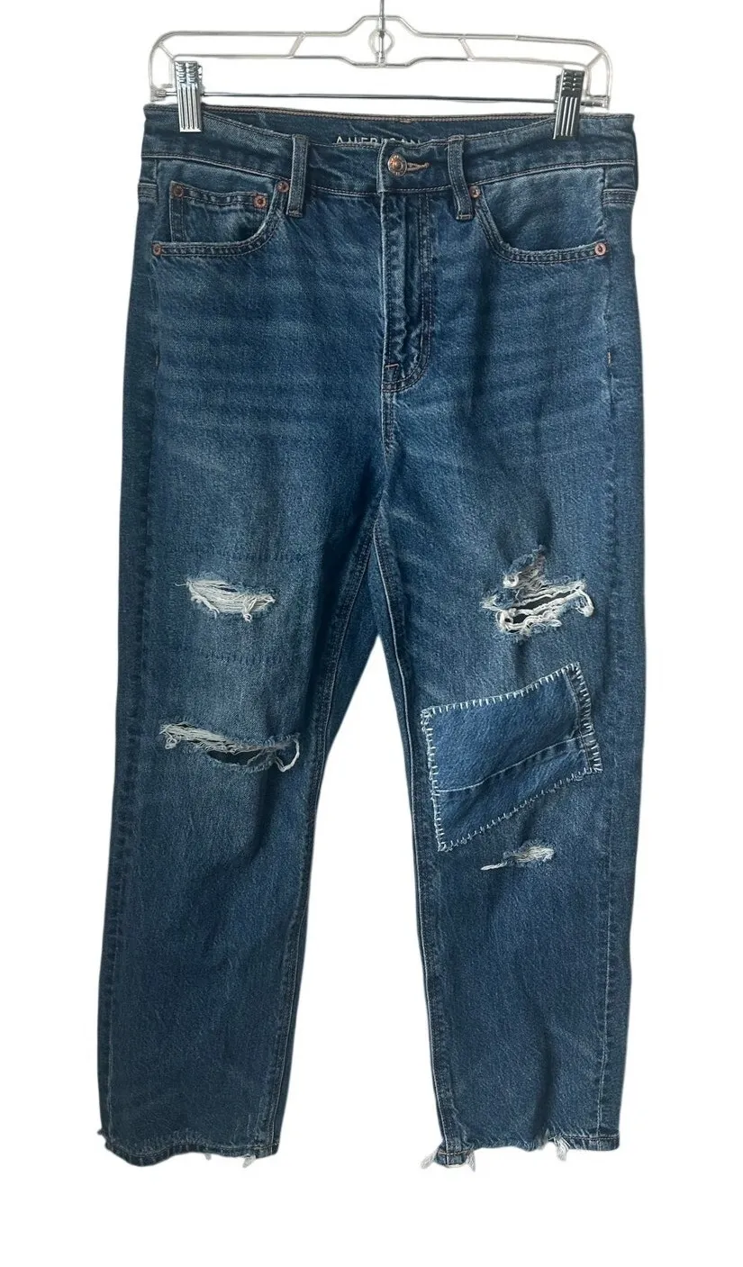 Size 6 short AE Strigid Dark wash jeans with rips and patchwork Inseam: 24.5 inches Gently worn, goo... Show more