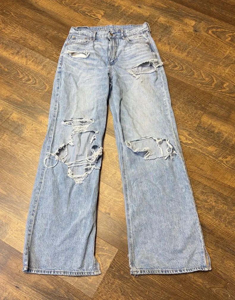 American Eagle Super High Rise Baggy Wide Leg Distressed Blue Denim Jeans Women’s Size 2 Destro... Show more