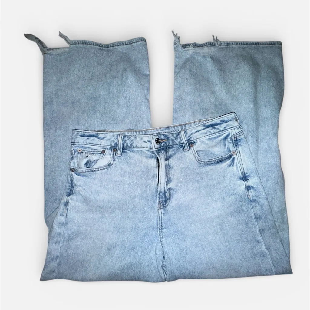 American Eagle super high rise baggy wide leg jeans in a light wash denim. Trendy relaxed fit with a... Show more