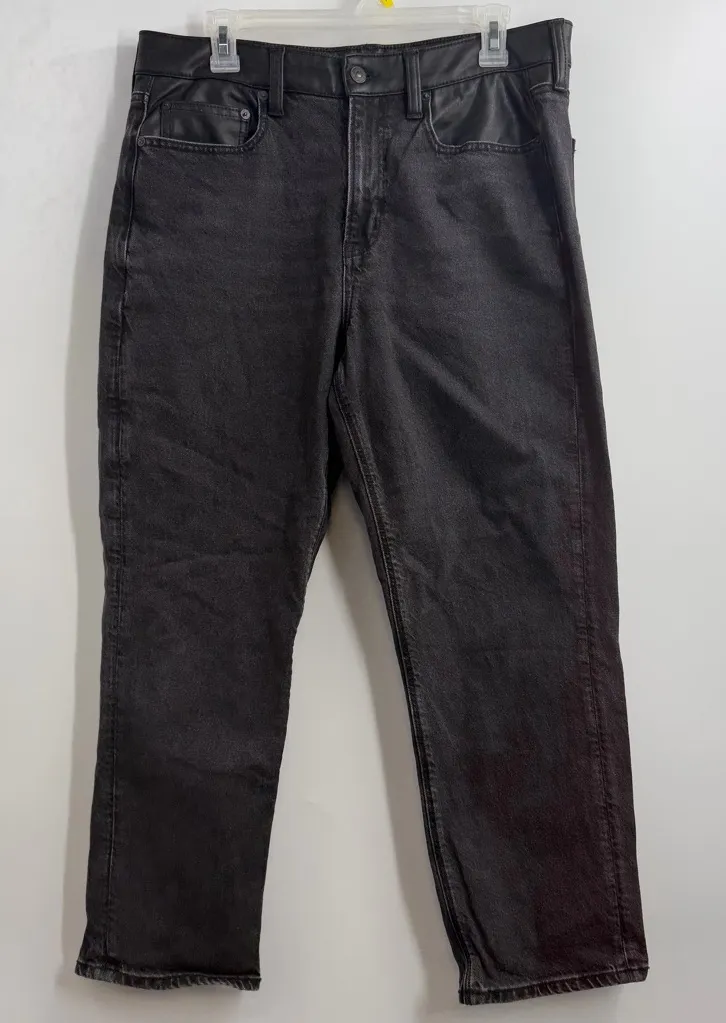 American Eagle vegan leather jeans, super high waisted jeans, ankle straight jeans women, black stretch jeans, faux leather jeans women, American Eagle size 12 jeans, edgy black jeans
