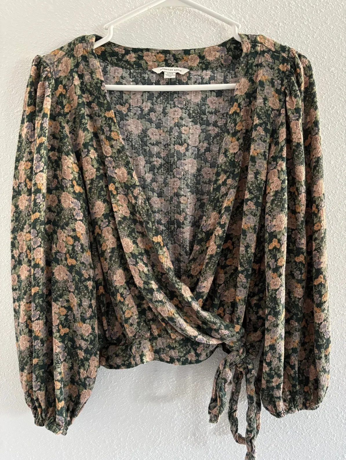 - Brand: American Eagle - Size: Women's Large - Color: Green, Cream, Pink - Details: Cropped, Tie Cl... Show more