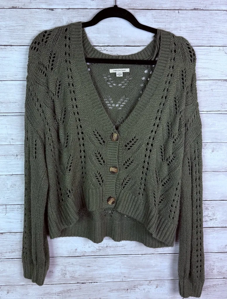 V neck Button up Eyelet knit details Green Size large Flat measurements approximately armpit 23” len... Show more