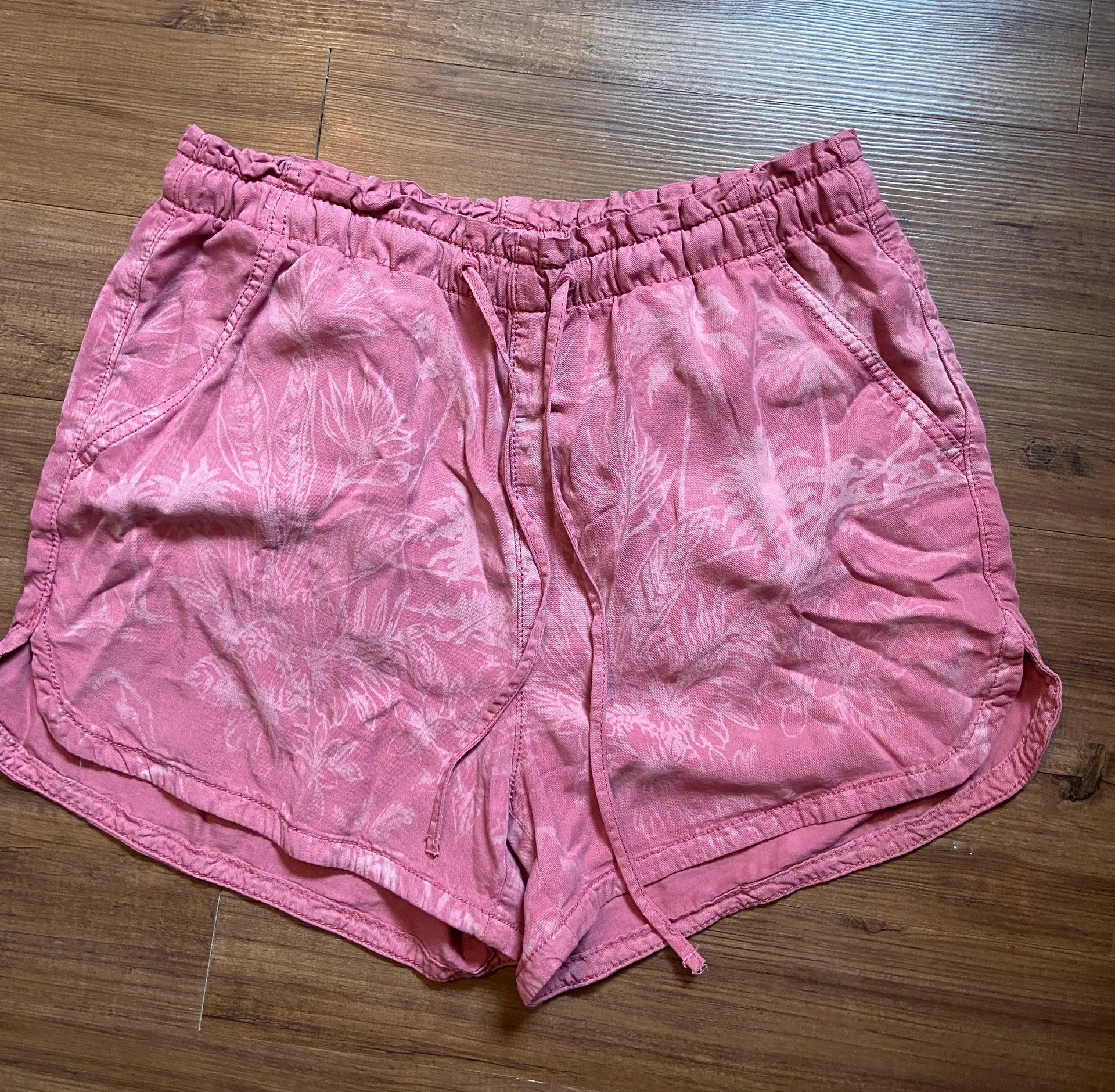 only been worn once! really cute pink floral print. they have a drawstring waist!
