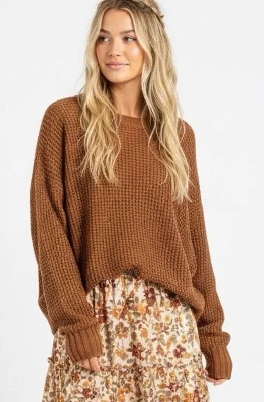 Waffle knit texture Crew neckline Long sleeves Ribbed cuffs and hem Cotton blend with recycled polye... Show more