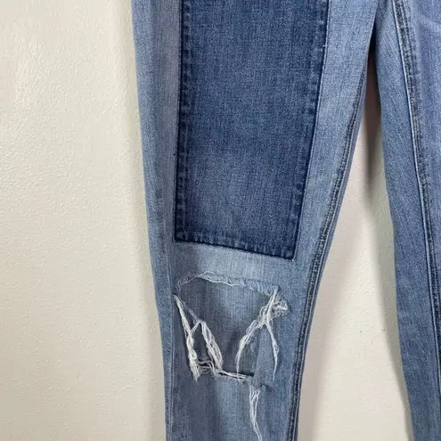 This is a pair of high rise slim/ tapered leg patchwork distressed button fly jeans from American Ea... Show more
