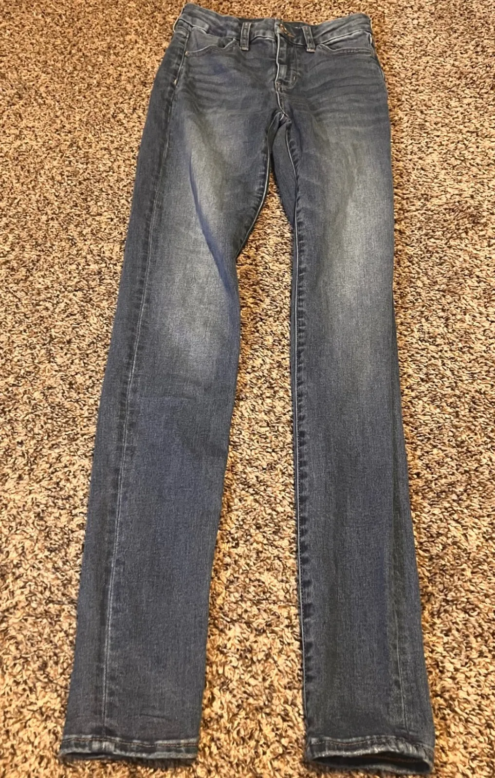 Curvy Hi-Rise Jegging Jeans in X-Long length. These jeans offer a comfortable and flattering fit with their signature stretch technology, perfect for everyday wear. The versatile wash and slim silhouette make them ideal for transitioning from a casual daytime look to an evening out. Measurements: • Waist: 12 in • Rise: 10 in • Inseam: 31.5 in Style: Jegging Department: Women Fabric Wash: Medium Waist Size: 25 in Accents: Button, Logo Type: Jeans Features: Stretch, Pockets, Comfort Fit: Slim Pattern: Solid Rise: High (Greater than 10.5 in) Fabric Type: Denim Inseam: 34 in Material: Cotton Blend, Polyester, Elastane Closure: Button, Zip Keywords: American Eagle Jeans, Women's Jeans, Curvy Fit Jeans, Hi Rise Jeans, Jeggings, Stretch Jeans, X-Long Jeans, Size 0 Jeans, Blue Jeans, Casual Jeans, Denim, Fashionable Jeans, Everyday Jeans