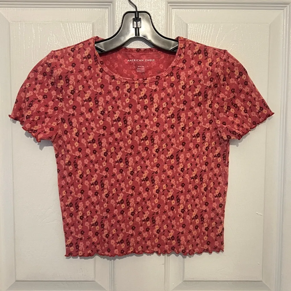 Great condition AMERICAN EAGLE Women’s Red Ditsy Floral Print Waffle Knit Short Sleeve Crop Top Size... Show more
