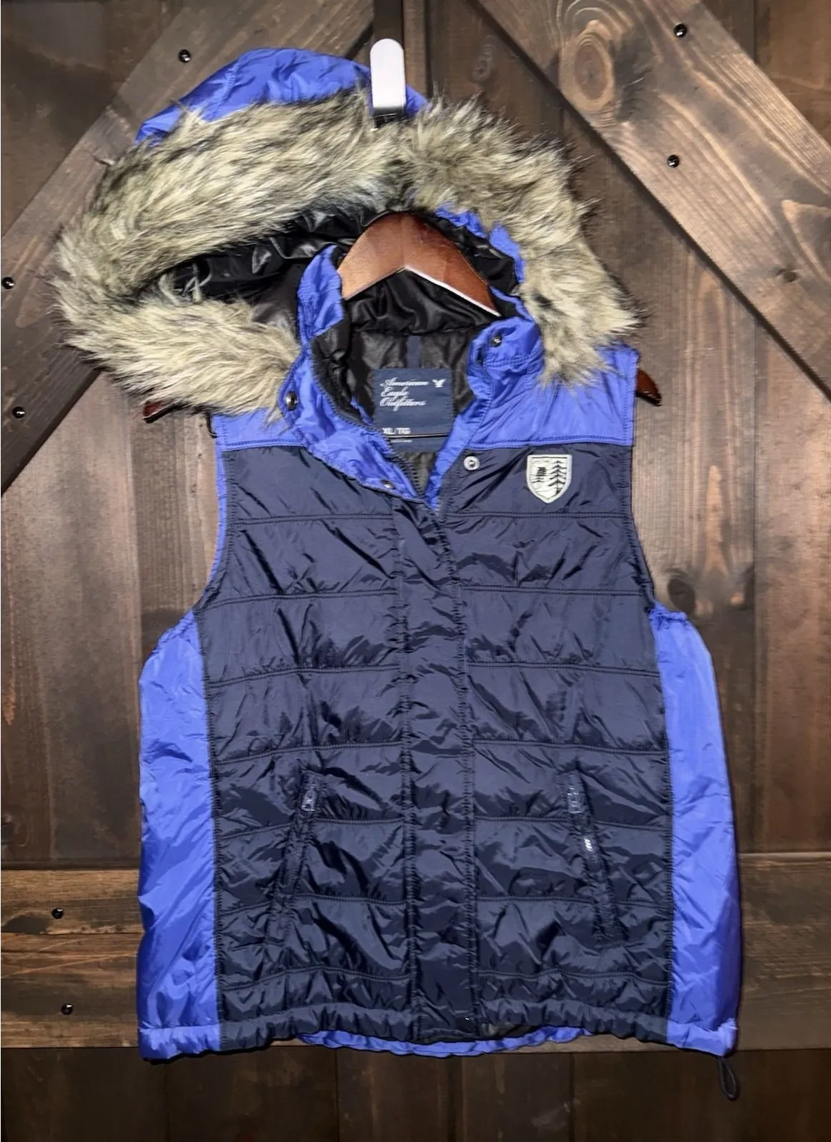 American Eagle Y2K Women's XL AE Faux fur trim Hooded Puffer Vest 2010