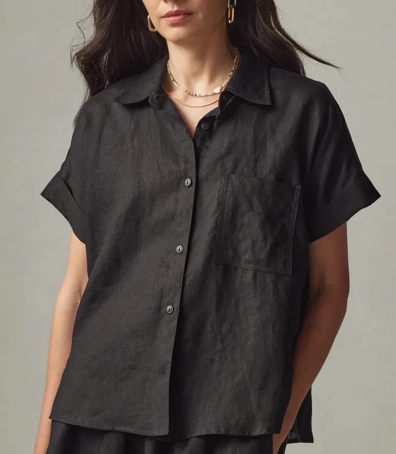 American Giant black linen short sleeve button up shirt. This classic collared shirt features a sing... Show more
