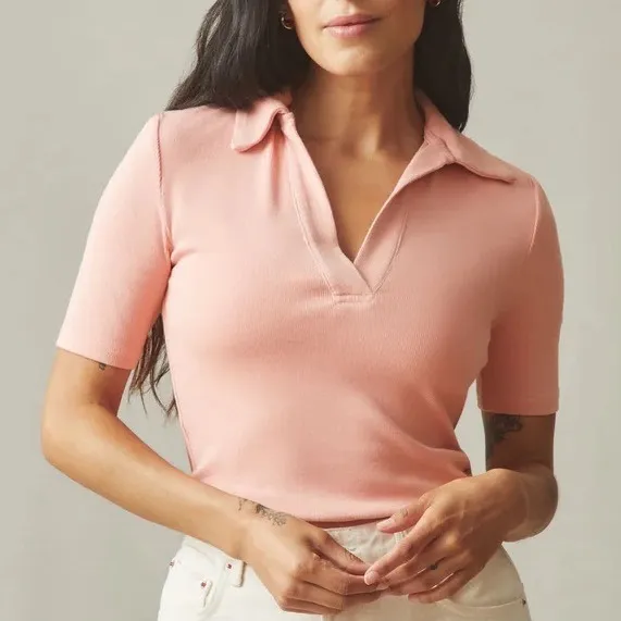 Coral ribbed short sleeve polo shirt by American Giant. This collared top features a deep V-neckline... Show more