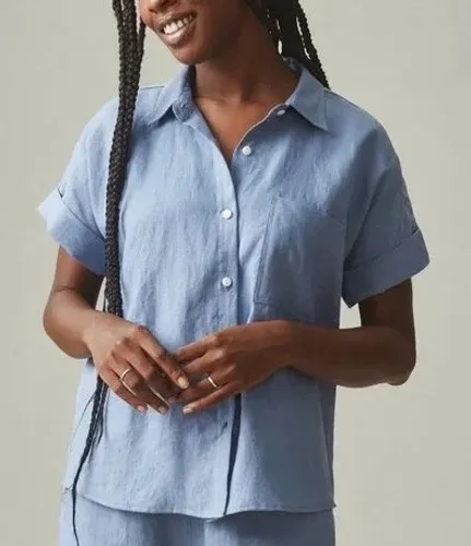 AMERICAN GIANT linen button up shirt in blue. This short sleeve top features a classic collar, a si... Show more