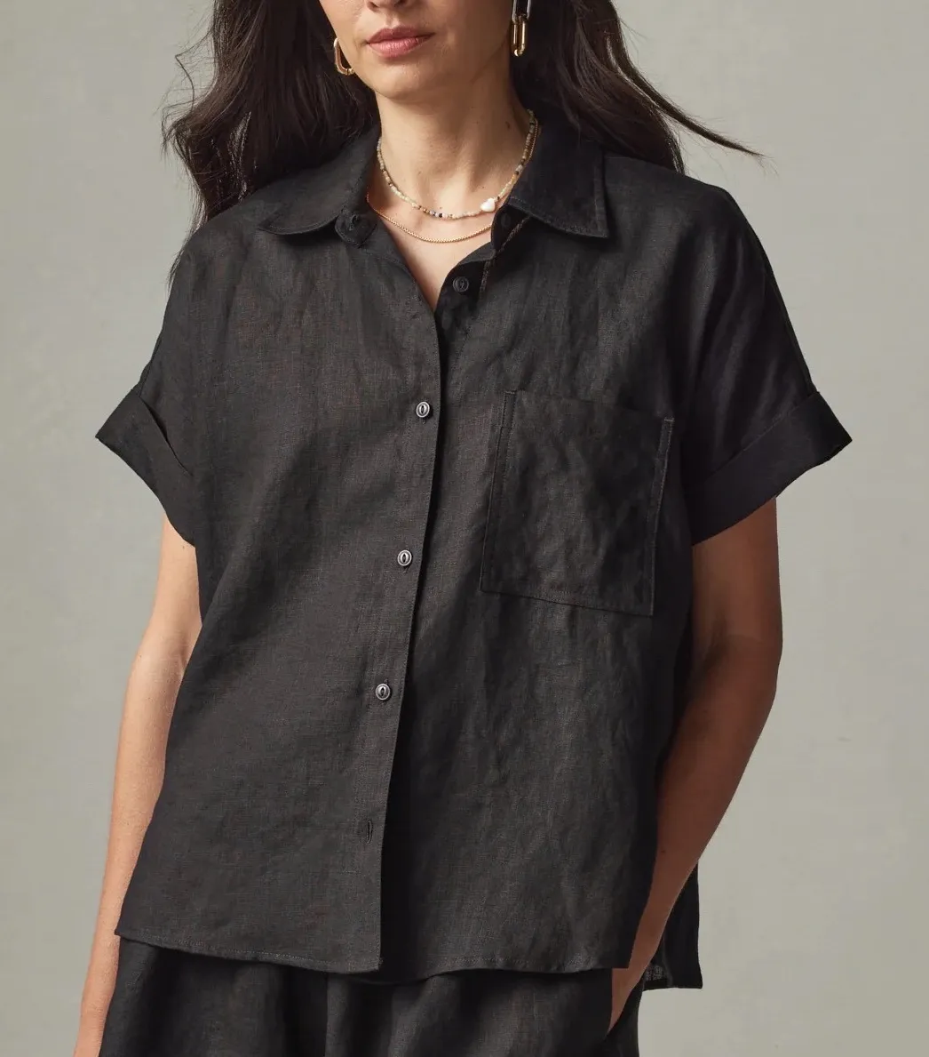 American Giant Easy Linen Shirt in Meteorite black. This classic button-up features a comfortable short sleeve design and a breathable linen construction. The versatile style makes it perfect for a casual outing or a relaxed day at the office. Measurements: • Chest: 23 in • Length: 24 in Type: Blouse Department: Women Style: Basic Material: Linen Neckline: Collared Sleeve Length: Short Sleeve Sleeve Type: Casual Sleeve Pattern: Solid Accents: Button Features: Lightweight, Easy Care Fit: Relaxed Fabric Type: Woven Occasion: Casual, Workwear Closure: Button Season: Summer, Spring Keywords: linen shirt, button down, short sleeve, black shirt, American Giant clothing, casual wear, workwear, minimalist, breathable, summer top, travel friendly All orders are shipped the same business day or the next business day. Thank you for supporting my small business.