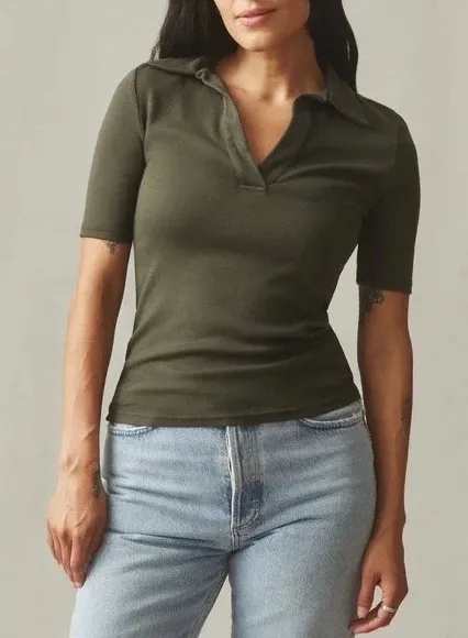 Olive green ribbed collared short sleeve top. A versatile piece offering a blend of classic style and modern comfort. Perfect for casual outings or dressing up for a smart-casual occasion. Measurements: • Chest: 17 in • Length: 24 in Type: Polo Department: Women Style: Basic Material: Cotton, Modal, Spandex Neckline: Collared Sleeve Length: Short Sleeve Sleeve Type: Classic/Fitted Sleeve Pattern: Solid Features: Easy Care Fit: Slim Fabric Type: Knit Occasion: Casual Closure: Pullover Season: Spring, Summer, Fall Garment Care: Machine Washable Keywords: American Giant, Collared Shirt, Ribbed Knit, Short Sleeve, Olive Green, Casual Top, Smart Casual, Everyday Wear, Basic, Wardrobe Staple, Comfortable, Versatile All orders are shipped the same business day or the next business day. Thank you for supporting my small business.