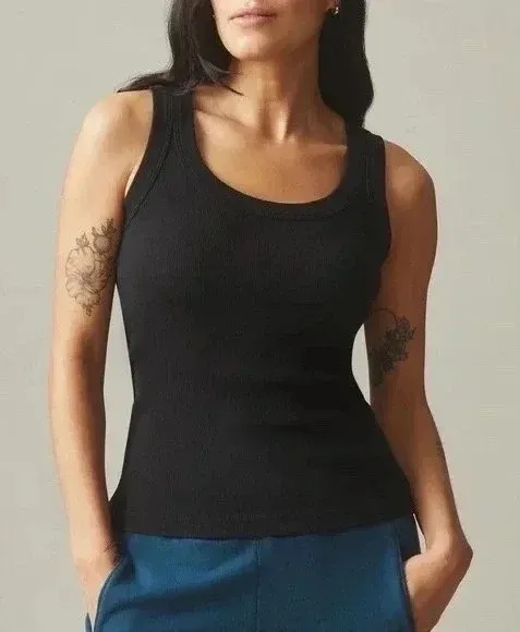 American Giant ribbed tank top in black. This essential layering piece offers a comfortable and flattering fit, perfect for everyday wear. Its versatile design makes it ideal for casual outings, athletic activities, or as a foundational piece for any wardrobe. Measurements: • Chest: 14 in • Length: 23 in • Size: L Type: Tank Department: Women Style: Basic Material: Cotton, Spandex Neckline: Scoop Neck Sleeve Length: Sleeveless Sleeve Type: Classic/Fitted Sleeve Pattern: Solid Features: Stretch Fit: Slim Fabric Type: Knit Occasion: Casual Closure: Pullover Season: Summer, Spring Garment Care: Machine Washable Keywords: basic tee, layering, everyday wear, athletic, foundational, summer, staple, fitted, comfortable, ribbed texture, American made, workout, casual All orders are shipped the same business day or the next business day. Thank you for supporting my small business.