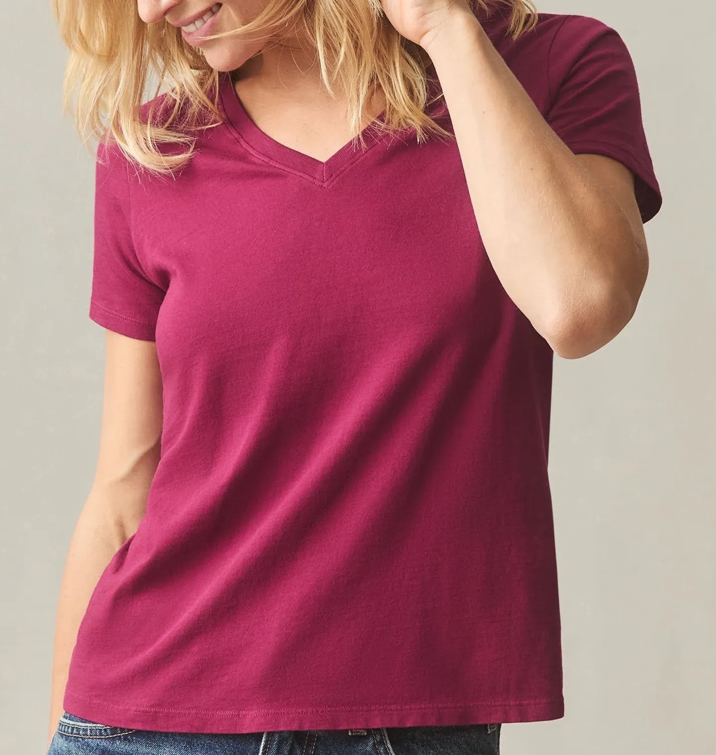 American Giant women's red V-neck t-shirt made in the USA. A classic staple for any wardrobe, this t... Show more