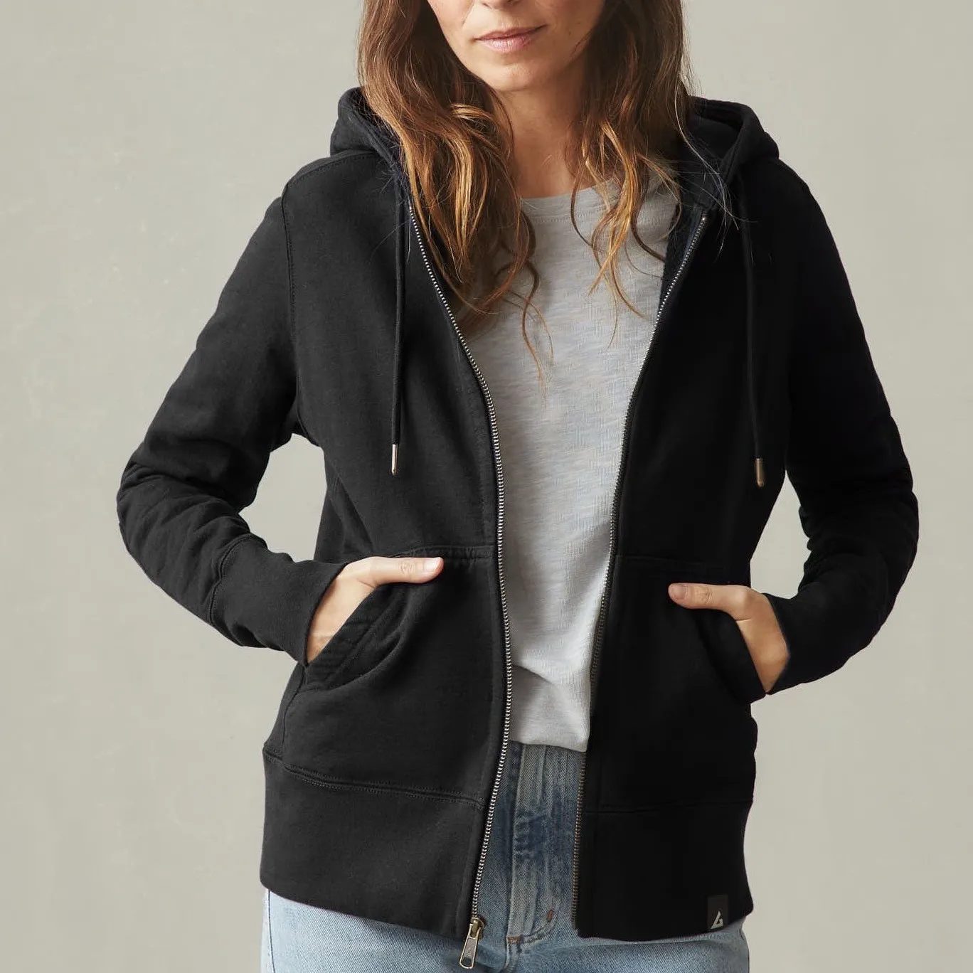 American Giant black full zip hoodie for women. This comfortable and durable hooded sweatshirt featu... Show more