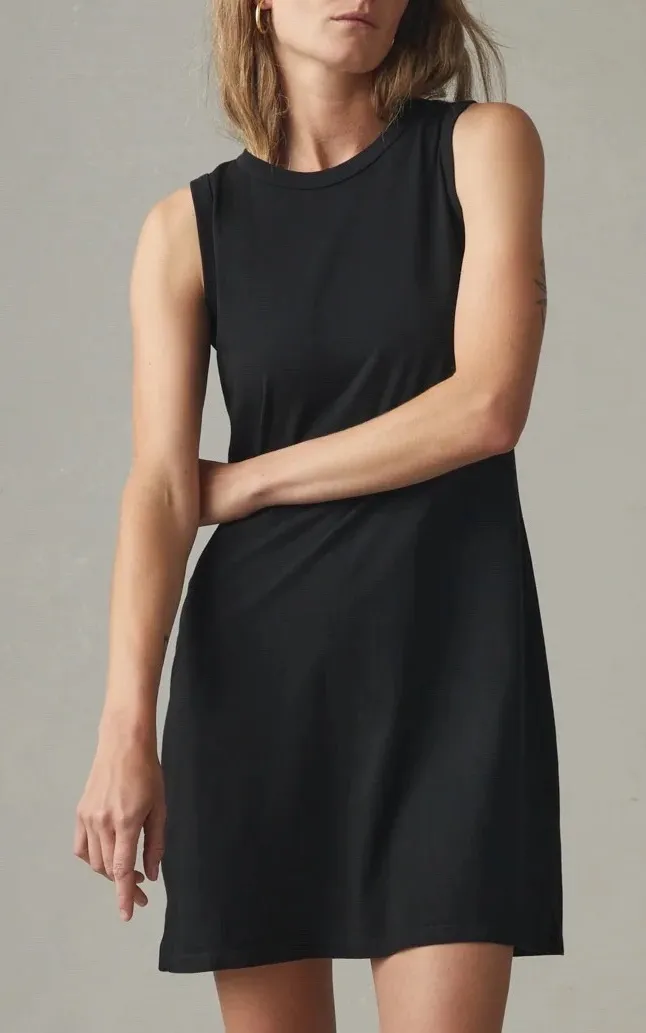 A black ribbed cotton tank dress from American Giant. This sleeveless dress offers a comfortable and... Show more