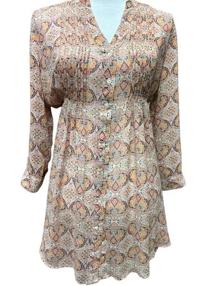 American Rag Boho Pleated Long Sleeve V Neck Dress Size S Arrow Tan Pink Cream This boho dress chec... Show more