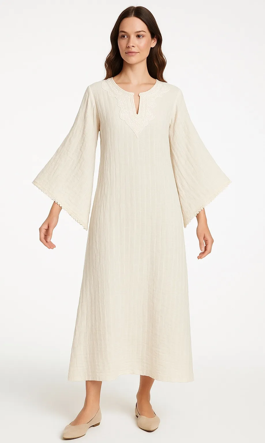 Beautiful 1970s Evelyn Pearson muslin-style boho caftan dress featuring a textured gauze cotton fabr... Show more