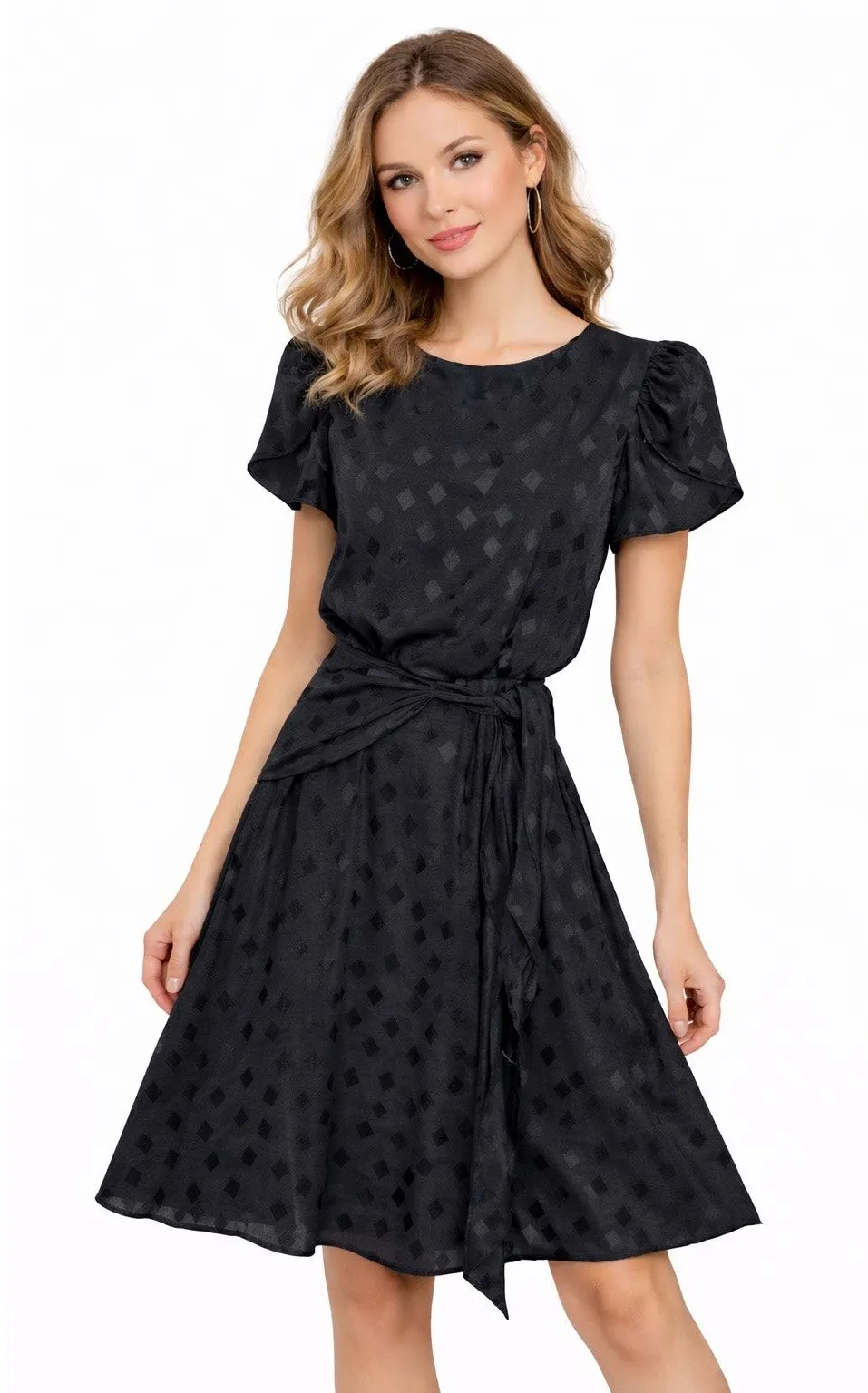 Elegant vintage David Brown dress from the 1980s in a rich black jacquard with tonal diamond pattern... Show more
