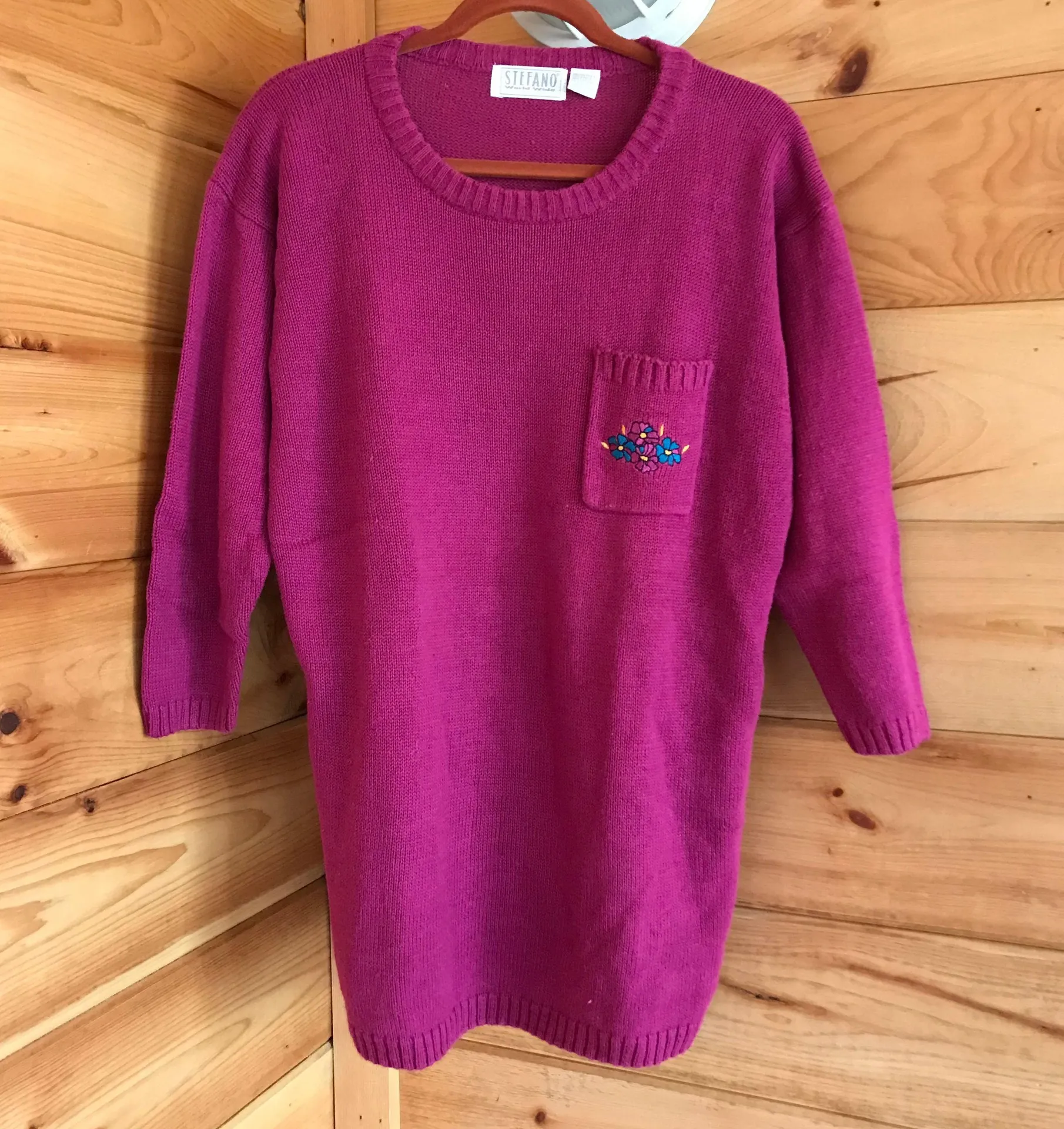 ADORABLE VINTAGE BRIGHT PASTEL PINK FLORAL DETAIL SWEATER! This is a bright pink knit sweater w/ cropped 3/4 length sleeves and pocket w/ embroidered floral detailing on the chest! Brand Stefano World Wide! Tag size OS best fits Women’s Large-XL!