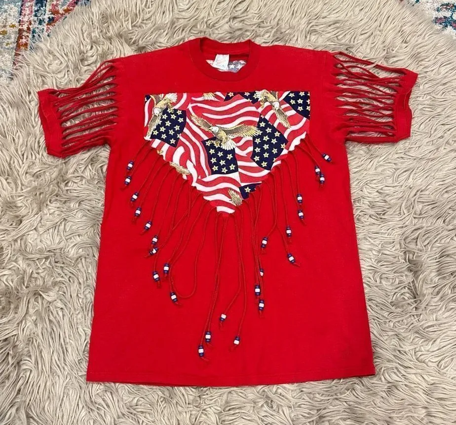 Handmade vintage fringe and beads American flag USA t-shirt large. Unfortunately has some stains as shown in pictures. Still a very cool item for concerts, picnics, 4th of July, and other fun occasions. 20.5” bust 28” length