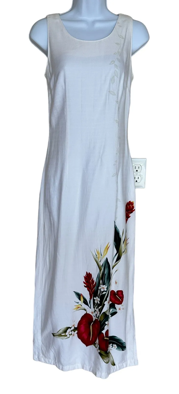 modest scoop neckline, sheath cut, gorgeous hibiscus flourish print on the bottom, lined, made in H... Show more