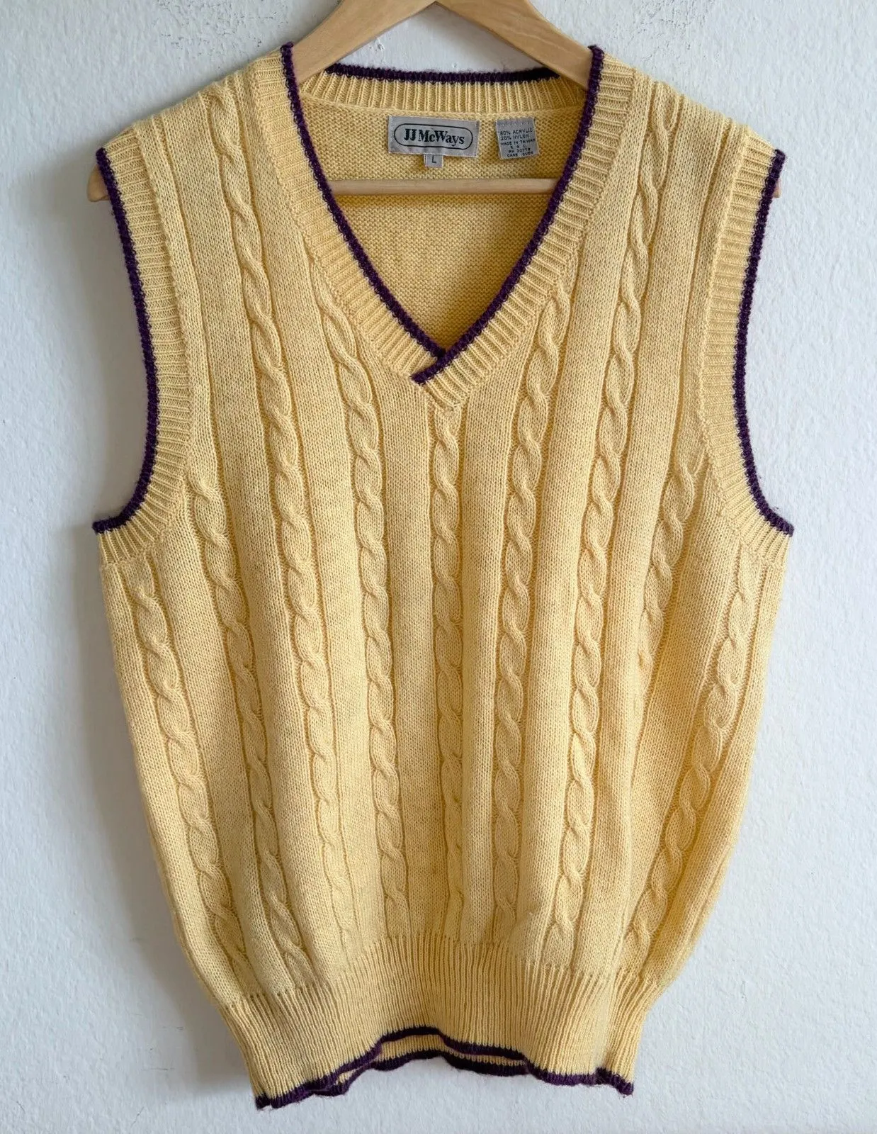 JJ MCWAYS Vtg 80s Yellow Purple Cable Knit V-Neck Retro Chic Sweater Vest, lightweight! Made of acry... Show more