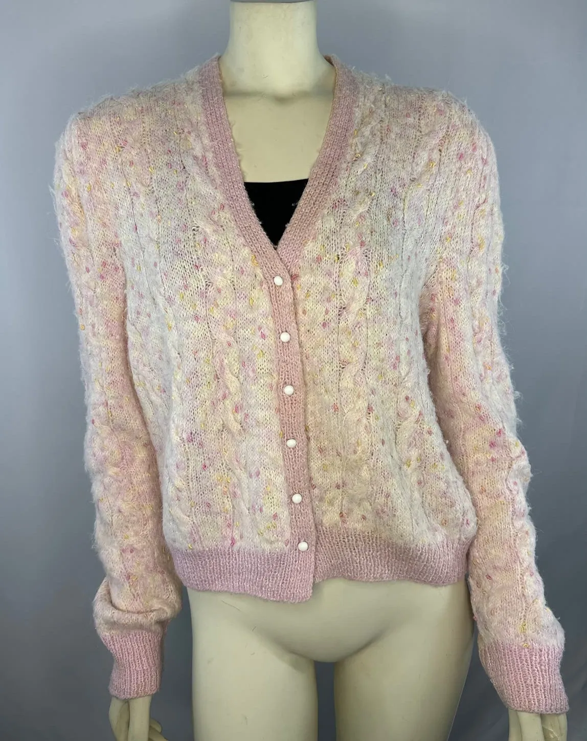American vintage hand, knit Mohair blend sweater in cream with shades of pink and yellow Six white b... Show more