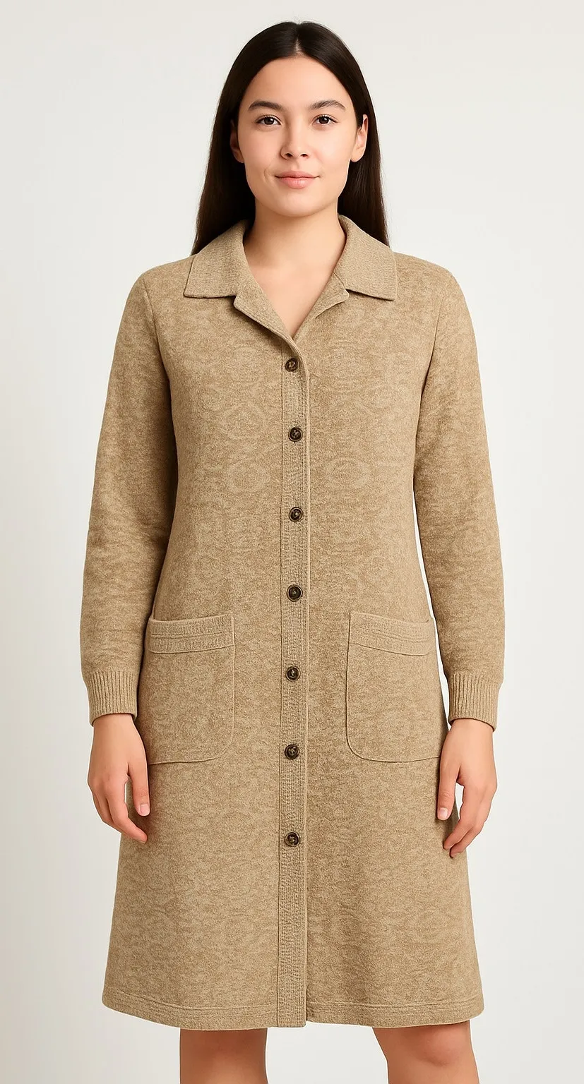 Beautifully detailed vintage Tannel knit sweater dress from the 1970s, featuring a warm beige and cr... Show more