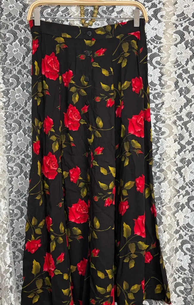 Please see pics for details. The skirt is in excellent condition except for the elastic in the back that is no longer very elastic. I would just purchase this expecting no stretch. Other than that, no holes, stains or tears. Front center button closure so you can create a front center slit more or less to your choosing. This skirt is so beautiful. The tag says, medium, but I think it is a small medium, but not enough to say that it is an official small. Measurements include… Waist and length. Please be aware before purchasing. Thank you for checking out my listing! Lots more unique treasures in my listings – apparel, accessories, vintage, collectibles, one of a kinds, trade beads, textiles, crafting supplies and more. #Vintage #90s #VintageSkirt #RosePrint #BlackSkirt #WhimsyGoth #Coquette #IndySleaze #Hippie #Bohemian
